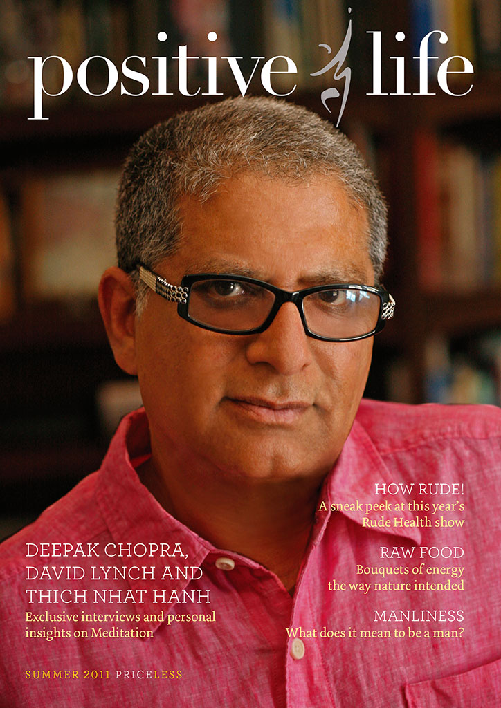 We’re celebrating 3 years creating Positive Life in style by offering you our Exclusive Interviews with DEEPAK CHOPRA and DAVID LYNCH, as well as insights from THICH NHAT HANH, on Meditation. We’ve kept our fuller-bodied 56 page layout, with lots of big and little editorials on a whole host of holistic lifestyle topics such as Raw Food, Restful Sleep and Manliness.